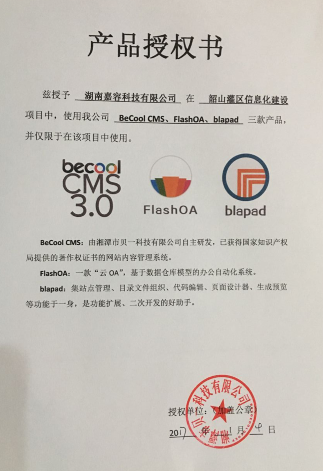 近日,貝一科技核心產品商業(yè)化又添喜訊,湖南華水科技、湖南嘉容科技和湖南六建集團三家公司,分別取得在韶山灌區(qū)2016年度續(xù)建配套與節(jié)水改造項目信息化建設工程項目中,貝一科技幾大核心產品(含BeCool CMS、FlashOA、blapad - 布拉編輯器) 的商業(yè)授權。