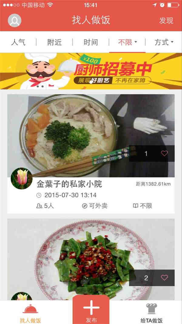 在家吃:由深圳在家文化傳播有限公司策劃的一種集家廚、社交、賺錢(qián)為一體的生活類(lèi)APP,旨在為人們提供一個(gè)更為方便舒心的“吃飯”平臺(tái),享受獨(dú)特的美味生活。是一款集家廚、社交、收益為一體的生活服務(wù)類(lèi)手機(jī)應(yīng)用軟件,主要面向兩個(gè)群體:擁有好廚藝卻賦閑在家的社區(qū)阿姨或大叔以及身處異鄉(xiāng)想吃家鄉(xiāng)菜又不想自己做飯的上班族。阿姨或大叔可通過(guò)手機(jī)客戶(hù)端發(fā)布自己的拿手菜以展示廚藝,賺取外快,吃貨可線(xiàn)上選擇做飯方式并預(yù)約廚師做飯。