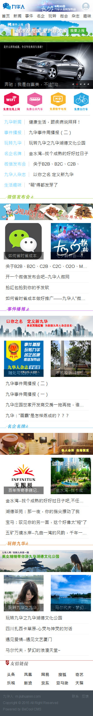 “九華人”微信公眾號和微網(wǎng)站是由湘潭市貝一科技科技有限公司、湖南云擎科技及智慧九華綜合管理中心三方共同設(shè)計開發(fā),此項目集合了新聞資訊類欄目和智慧九華的“事件上報”系統(tǒng),并將移動網(wǎng)站與微信進行了整合。