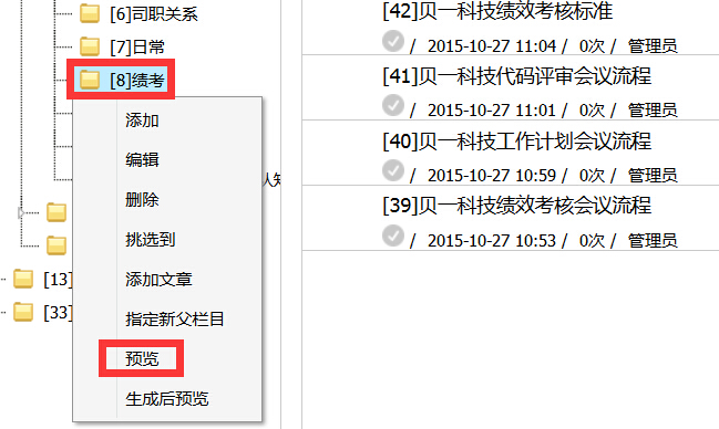 第二:需預(yù)覽文章對(duì)應(yīng)欄目,操作步驟選中新添加文章對(duì)應(yīng)的欄目后右鍵選擇“預(yù)覽”,文章所屬欄目預(yù)覽成功。如下圖中,新文章屬“績考”欄目,則選中績考右鍵選擇“預(yù)覽”。