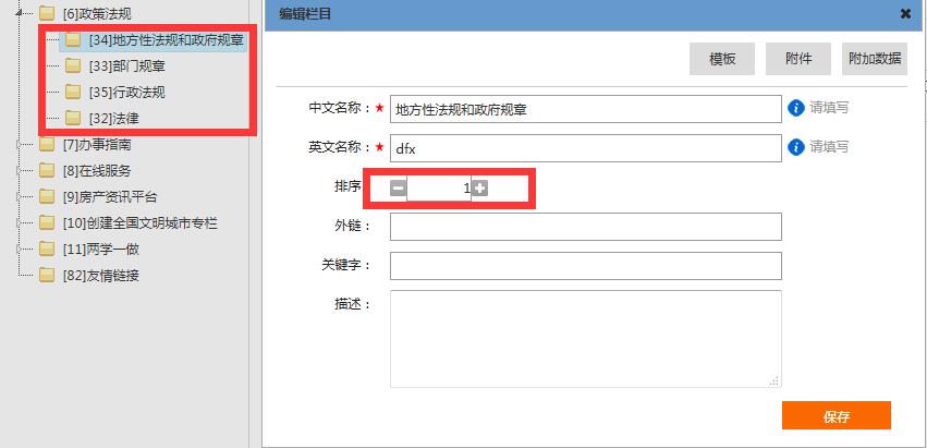 3、在欄目編輯窗中找到“排序”進行排序,為防止規(guī)則與前臺不符,排序規(guī)則與前臺模板人員進行溝通,兩邊一致即可。如下圖: