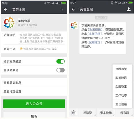 “芙蓉金融”服務號介紹及關注界面
